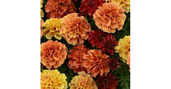 Чорнобривці розлогі Страубері Блонд (Tagetes patula Strawberry Blonde). Рання серія низькорослого розлогого чорнобривця з повними великими квітами, представлена унікальним кольором, який змінюється в залежності від освітлення. Завдяки цій особливості рослини називають "хамелеонами". Кущики висотою 20-25 см, вирівняні по габітусу. Рослина, яка не потребує надзвичайних умов вирощування. Для раннього цвітіння краще висіяти насіння на розсаду і висадити сіянці після загрози весняних заморозків. Чорнобривці цвітуть з ранньої весни і до пізньої осені. Утворюють красиві кулеподібні кущі, всипані квітами. Використовуються як у змішаних клумбах, так і разом з іншими однорічниками та багаторічниками.